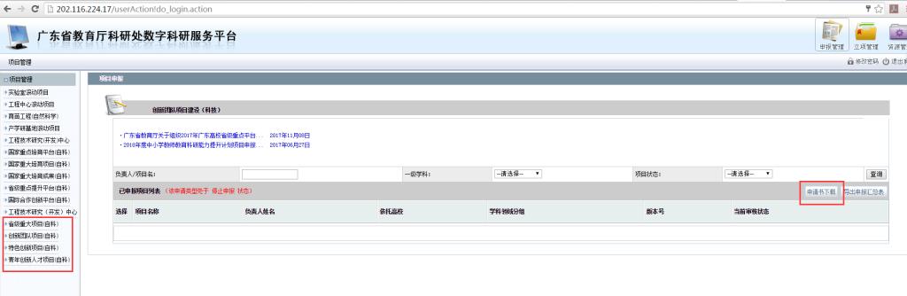 所有项目申报通过广东省教育厅科研处数字科研服务平台(http://210.76.75.91)进行申报,下载填写《2019年广东高校平台和科研项目申报书》(下载可参考下图),并上传申请书及相关附件材料至申报系统。未有申报帐号的申请人,请联系我处联系人。