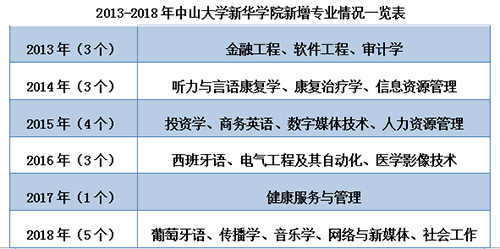 中山大学新华学院办学十二年来,在适应区域经济社会发展新形势和对接产业转型升级对复合型、应用型高素质人才需求的基础上,不断探索学科建设的完善和专业结构的调整,注重重点学科的培育、品牌专业的建设、特色专业的打造等根基性工作,在母体学校中山大学优势资源的支持下,其学科专业优势日渐显现。近年来,2138CC太阳集团在王庭槐校长提出的“学术强校、质量立校、特色兴校、开放办校”十六字方略的引领下,实行了“开天窗,接地气”系列教改举措,持续优化学科门类专业设置,2013年至今,2138CC太阳集团获教育部备案和审批的新专业共有19个(具体见下表)。